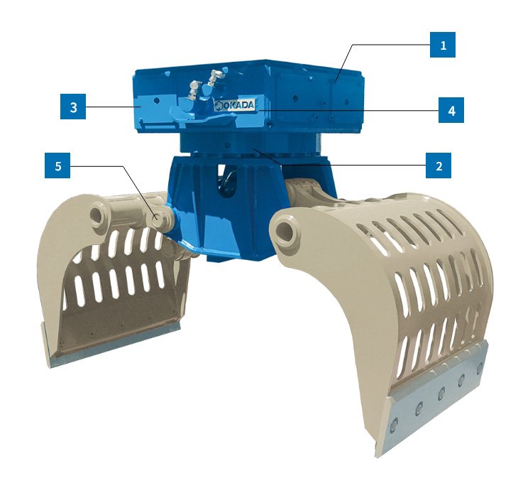 The grapples incorporate several hydraulic components used in the OKADA crushers and are based on decades of OKADA engineering experience.
