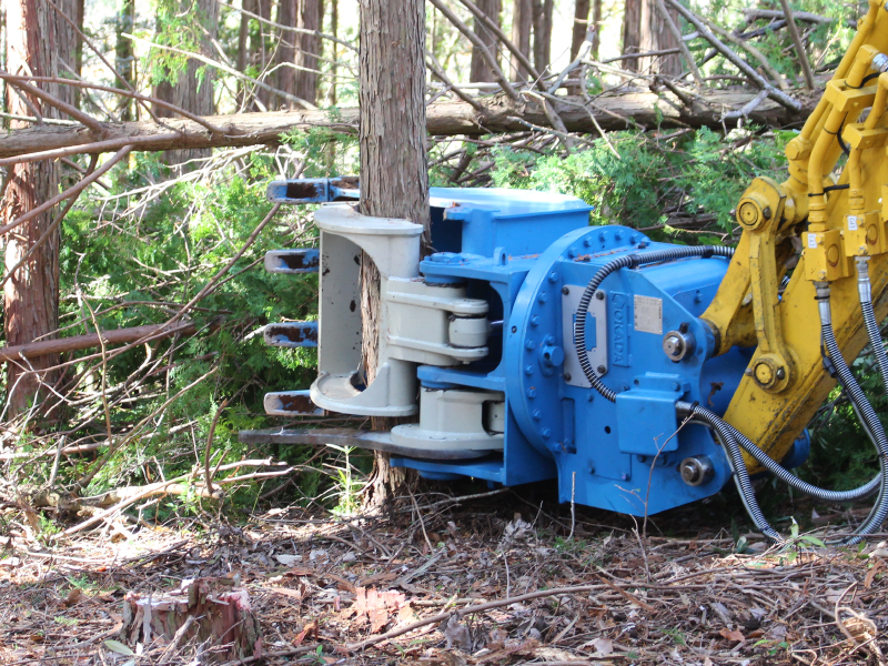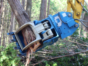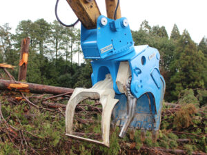 グラップルバケットに切断刃を搭載することで、油圧ショベル単体での路網作設が可能です。