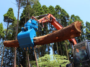 集材作業現場で使用する木材グラップルは、集材作業現場以外(木材市場・チップ工場等)で使用しても「車両系木材伐出機械」に該当します。