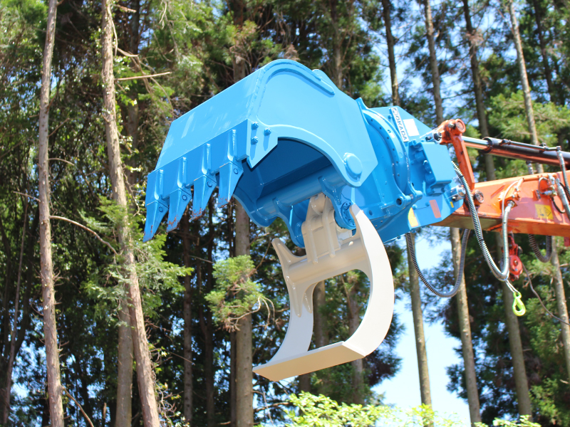 立木切断刃、材保定グラップルアーム、掘削用バケットを有する、林業・土木作業用複合アタッチメント。