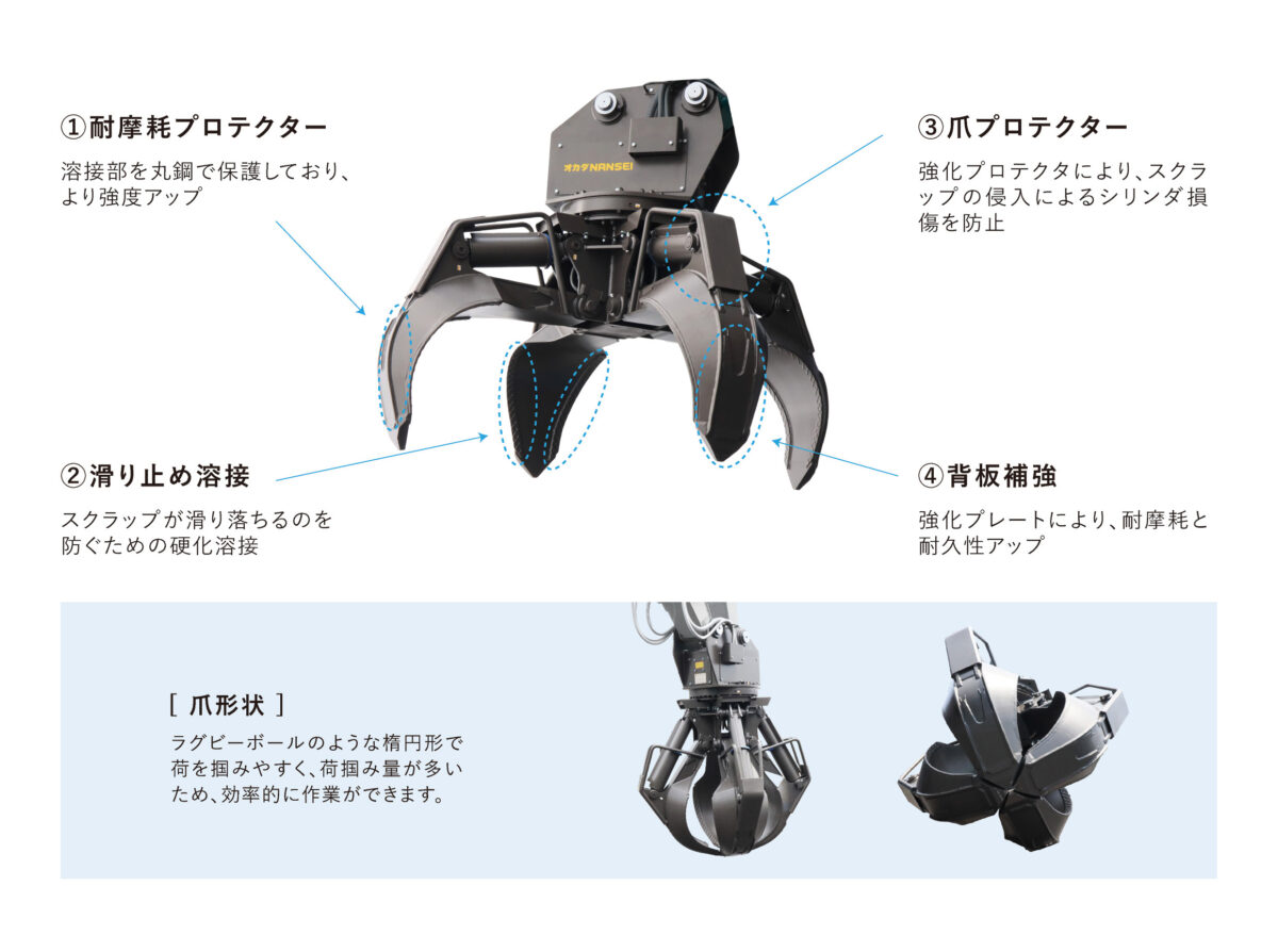 ※ポイント①耐摩耗プロテクタ ②滑り止め溶接 ③爪プロテクタ ④背板補強