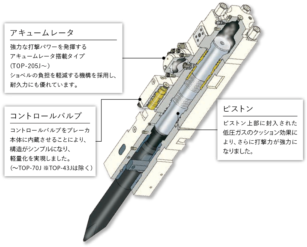 ・油圧パワーに窒素ガス(低圧ガス)エネルギーをプラスすることで、より強力な打撃力を生み出しました(~TOP-110J)。